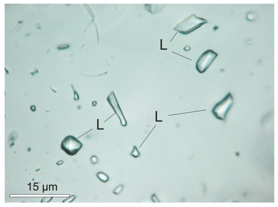 Monophase fluid inclusions in the amethyst crystal from Tevi agate (Figure 3G). L—liquid phase.