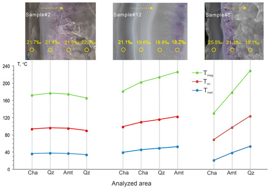 To specify the equilibrium formation temperature of Tevi agates, oxygen isotope analyses were performed on the profiles of three concentrically banded agate samples with different band sequences (Figure 13). In sample#6, the silica sequence is represented by fibrous chalcedony, amethyst, and quartz. In sample#2, it is composed of fibrous chalcedony, milky-white quartz, amethyst, and colorless quartz. Conversely, in sample#12, it consists of banded chalcedony as well as colorless quartz and is completed with amethyst. In general, the measured values δ18O in silica bands range from +18.1 to +25.5 ‰ (Table 2).