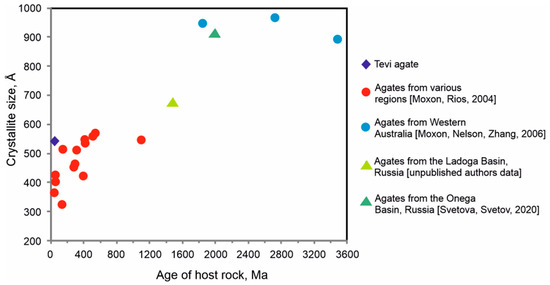 Crystallite growth in agate as a function of age. Data (circles) for agate hosts 3480–38 Ma from different regions of the world, with added data (triangles) for Paleoproterizoic (Onega Basin) and Mesoproterozoic (Ladoga Basin) agate hosts of Fennoscandian Shield (Russia) and for examined Tevi agate (rhomb). Markers are the mean crystallite size for each region [16,43,48].