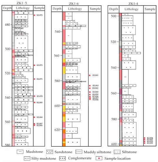 Twenty fresh sandstone samples of the Yaojia Formation were collected from three representative drill holes (ZK1-4, ZK1-6, and ZK1-5) in the study area (Figure 1). Table 1 and Figure 3 provide details about the sampling sites. These samples were primarily composed of gray-white or light-red, medium-grained sandstones. The samples were examined using a combination of thin-section identification, whole-rock geochemistry, and electron probe analysis.