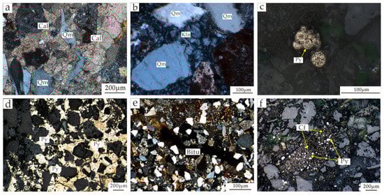 Photomicrographs of the Yaojia Formation sandstones. (a) Calcite metasomatizes quartz (+). (b) Kaolinite developed between the detrital particles in the form of a book leaf (+). (c) Framboidal pyrite (RL). (d) Colloidal pyrite (RL). (e) Bitumen (+). (f) Pyrite occupies the cell cavities of carbonaceous fragments (RL). (+) = cross-polarized light; (RL) = reflected light. Abbreviations: Qm, monocrystalline quartz; Cal, calcite; Kln, kaolinite; Py, pyrite; Bitu, bitumen; Cf, carbonaceous fragments.