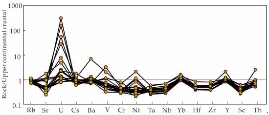 Table 4 lists the results of tests conducted on trace elements in the samples. The large ion lithophile elements such as Cs, Rb, Sr, and Ba have average contents of 4.93 ppm, 101.48 ppm, 223.94 ppm, and 693.40 ppm, respectively. High field strength elements such as Sc, Y, Nb, Ta, Zr, Hf, and Th have average contents of 4.29 ppm, 23.36 ppm, 10.95 ppm, 0.84 ppm, 100.39 ppm, 3.13 ppm, and 9.19 ppm, respectively. The normalized trace elements of the upper continental crust (UCC) with reference to Taylor and McLennan (1985) [] were applied, and the curve patterns were almost identical across all samples, with abundances approximately the same as those of the upper crustal elements (Figure 7). Moreover, these samples are extremely abundant in U, indicating a significant potential for mineralization. According to the average ratios of La/Sc, Th/Sc, Cr/Th, and Co/Th, the provenance is mainly situated in the upper crustal felsic source area [,] (Table 5).