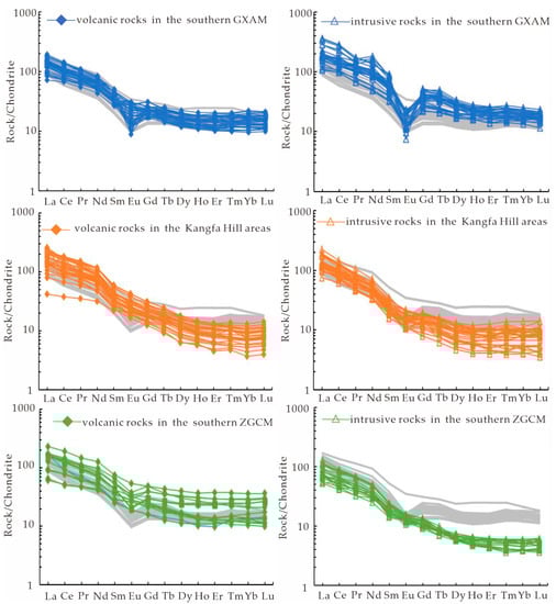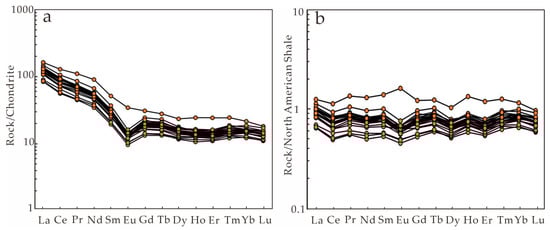Chondrite-normalized REE patterns (a) and NASC-normalized REE patterns (b) of the Yaojia Formation in the SW Songliao Basin. The chondrite normalized data are quoted from Sun and McDonough []; the North American shale standardization data are quoted from Haskin and Paster [].