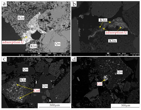 Adsorption uranium is one of the most prevalent forms of uranium in the study area. Uranium is primarily absorbed by clay minerals in sandstone. A high content of clay minerals is preferable for uranium enrichment, as they have strong adsorption properties [] (Figure 9a,b). Clay minerals are relatively abundant in the study area. In BSE images, uranium is adsorbed by clay minerals and distributed in vein or disseminated form.