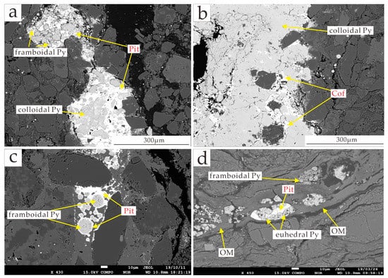 Characteristics of uranium minerals and pyrite in the Yaojia Formation sandstones. (a) Pitchblende grows around framboidal and colloidal pyrite. (b) Coffinite distributed in an irregular shape around colloidal pyrite. (c) Pitchblende distributed at the edges of the framboidal pyrite. (d) Pyrite and pitchblende are simultaneously generated in the organic matter cell cavity. Abbreviations: Pit, pitchblende; Py, pyrite; Cof, coffinite; OM, organic matter.