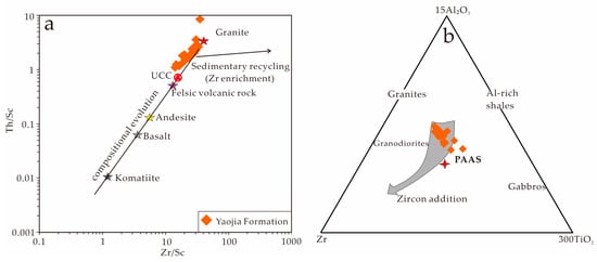 (a) Zr/Sc-Th/Sc diagram []; (b) 15Al2O3-Zr-300TiO2 diagram for the Yaojia Formation sandstones [,].