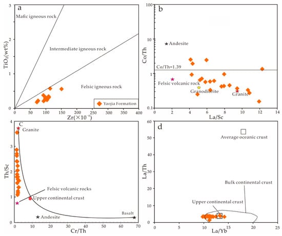 The source discrimination diagrams for the Yaojia Formation sandstones. (a) TiO2-Zr diagram []; (b) La/Sc-Co/Th diagram []; (C) Th/Sc-Cr/Th diagram []; (d) La/Th-La/Yb diagram [].