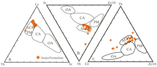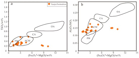 The geochemical properties of sedimentary rocks may provide valuable insight into the composition of the source rock as well as the tectonic setting of the source areas [,]. Bhatia (1983, 1985) [,] classified basin tectonic types based on the character of the crust into four categories: oceanic island arc (OA), continental island arc (CA), active continental margin (ACM), and passive margin (PM). Major elements, such as Al2O3, SiO2, TiO2, Fe2O3T, and MgO, have relatively high stability. In contrast, K2O and Na2O are highly unstable due to the considerable effects of potassium metasomatism and Na+ loss during weathering, deposition, and diagenesis. Furthermore, calcite cement contributes the majority of the CaO content. Therefore, in this paper, the contents and ratios of the stable oxides Al2O3, SiO2, TiO2, Fe2O3T, and MgO are used to distinguish source areas and tectonic settings. In the TiO2-(Fe2O3T+MgO) diagram, the majority of the Yaojia Formation samples fall within the ACM field, with a tendency to the PM field, and three samples out of any of the fields (Figure 13a). The Al2O3/SiO2-(Fe2O3T+MgO) diagram shows that samples mostly fall within the ACM region (Figure 13b).
