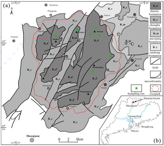 (a) Simplified geological map of Danxia basin (modified from reference [30]). (b) The location of Danxia basin in northern Guangdong province, China.