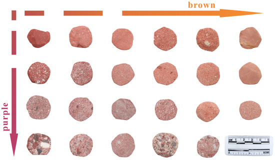 Given the above, the captivating color of red beds is due to the presence of microfine hematite, as reported in previous studies [18,33,34]. In addition, this study has also identified the role of goethite in the coloration of the Danxia Formation. Although less prevalent than hematite, the presence of goethite imparts a subtle brown hue to the sediments. The reddish-purple in red beds may be determined by the content, arrangement, and particle size of hematite [8,35,36,37]. While cation substitution can slightly adjust the color of hematite [38], it does not appear to have a decisive impact on the overall coloration of the red beds. Instead, variations in the relative content and particle size of hematite and goethite principally account for the observed color differences between reddish-brown and reddish-purple in the Danxia formation.