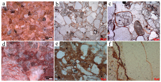 In the Danxia Formation, red minerals that contribute to the overall color of the rocks primarily exist in two states: dispersed and granular (Figure 5 and Figure 6). Despite the lower concentration, dispersed coloring minerals are responsible for the overall bright red color of the red beds. These minerals are generally distributed on the surface of detrital grains or along overgrowth edges and can be observed almost everywhere (Figure 5a–c). Dispersed coloring minerals can also be found in the matrix or fractures between detrital grains, as shown in Figure 5d–f. The distribution of dispersed coloring minerals is not uniform and often occurs in localized areas of enrichment.