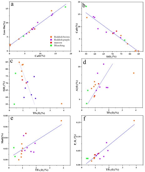 Binary plots of selected major elements: (a,b) CaO vs. Loss On and SiO2; (c–f) Tfe2O3 vs. SiO2, Al2O3, MnO, and P2O5, respectively.