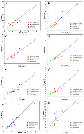 The most remarkable difference in all elements is the total amount of iron, given as TFe2O3, which is depleted compared to sandstones in the eastern part of China by up to 64% (Table 1). And even then, TFe2O3 exhibits a strong positive correlation with the red minerals (Figure S1, Supplementary Materials), which is typical of red beds. Moreover, the content of TFe2O3 is much lower in the bleached samples because of the absence of iron-bearing grain coatings (Table 1). Despite this, interestingly, TFe2O3 shows a significant positive correlation with TiO2, P2O5, Sc, Cr, Co, Ni, Cu, Zn, and REE (Rare Earth Elements) in all rock types, and are somewhat color-dependent, in that purplish red beds have highest concentrations, brownish and maroon red rocks have moderate, and bleached samples lowest (Figure 7f and Figure 8). In addition, Tfe2O3 also shows a moderate positive correlation with Al2O3 and MnO (Figure 7d,e), but displays a moderate negative correlation with SiO2 (Figure 7c). However, these elements do not appear to vary significantly with color variations of red beds.