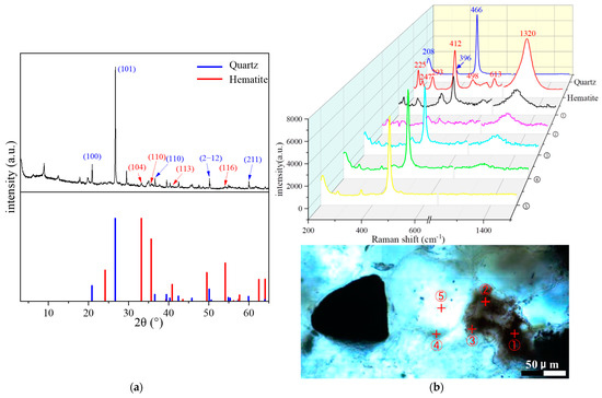 (a) XRD pattern of the reddish-brown sandstone as well as the standard quartz and hematite as reference; (b) The micro-Raman spectra of the reddish-brown sandstone, along with standard quartz and hematite as references. The concentration of hematite decreases as the testing points vary from ① to ⑤.