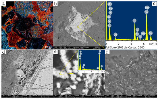 SEM images of strongly altered iron-containing mineral indicate the spatial and temporal inheritance correlation between authigenic fine hematite crystals and unstable iron-bearing grains (Figure 10, Figure 11 and Figure 12). Hematite in the Danxia formation commonly occurs as enriched and well-crystalline around the altered iron-bearing grains, while being relatively depleted and finer-grained away from these grains. For instance, ilmenite grains have been highly altered along their edges and are mostly replaced by hematite and anatase (Figure 10a–c). Much of the hematite occurs as euhedral clusters of microcrystals growing in fissure spaces near the altered ilmenite (Figure 10d,e), with the remainder of the mineral occurring as finely dispersed grains in the matrix (Figure 10f). Micas (mostly biotite) that have been intensively deformed and altered during diagenetic processes are commonly replaced by lenticular or lath-shaped hematite along their cleavage planes (Figure 11). Meanwhile, hematite also occurs as spherical aggregates within abundant spaces which were supported by the biotite fragments (Figure 11b,c) and as fibrous aggregates infilling in insufficient and smaller voids (Figure 11f). In some instances, hematite occurs as replacement of magnetite altered along the internal grains (Figure 12a–c).