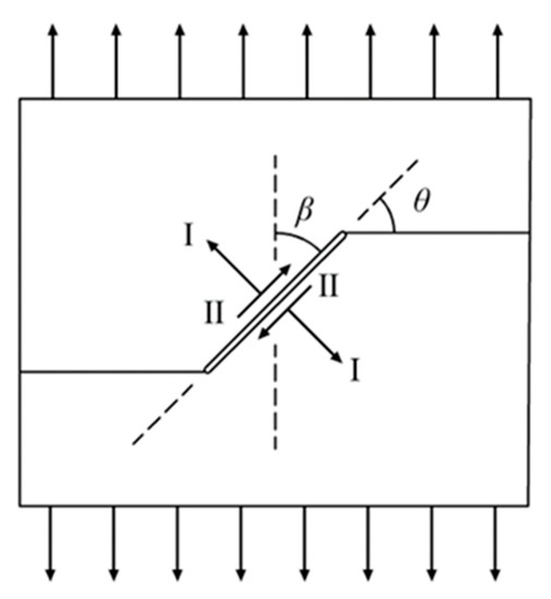 The blasting used for mining engineering and the piercing used for mineral processing engineering when breaking minerals with a crusher are mainly tensile failures. Among them, the externally applied tensile load always forms a certain angle with the pre-existing cracks in the material, thereby affecting the distribution of local loads. In this condition, the cracks are subjected to both tensile load (Type I load) and shear load (Type II load) [11,18,19], as shown in Figure 1, where is the initial crack angle, and is the crack angle (as defined in Section 2.3). The energy consumed in crushing and the surface morphology of the comminution products will change with the change from the pre-existing crack angle in the broken material, thereby affecting the energy consumption of the comminution equipment and the effectiveness of the following sorting process.