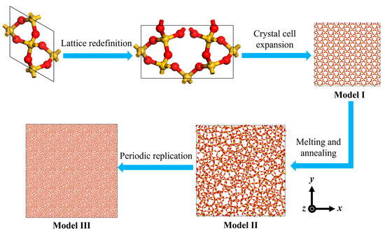 In order to create an amorphous SiO2 model with pre-cracks at different angles, high-temperature melting and annealing process is conducted to α-quartz under the ReaxFF [21] force field to prepare a complete amorphous SiO2 model, as shown in Figure 2. First, Materials Studio software is used to import a α-quartz crystal cell. After redefining and expanding the lattice, the SiO2 crystal model I is obtained. Then, model I is imported into LAMMPS software, and the system is relaxed for 50 ps at 4000 K in NVT ensemble to obtain SiO2 high-temperature molten state structure. The pressure of the system is controlled to 1.013 × 105 Pa by the Nose-Hoover barostat, and the system is cooled to 300 K at an annealing rate of 5 K/ps in NPT ensemble. After annealing, the system is relaxed at 300 K and 1.013 × 105 Pa in NPT ensemble to obtain amorphous SiO2 model II. Model III is obtained by periodically replicating model II and relaxing the system for 50 ps [14,15,20,22,23]. The simulation time step is set to 0.5 fs. The main parameters of the three models are shown in Table 1. Vo et al. [24] indicated that when the atomic number scale is larger than 5 × 104 in periodic boundary conditions, the mechanical properties of the model will be relatively stable. Thus, the atomic scale of Model III can meet the accuracy of the following simulation experiment.