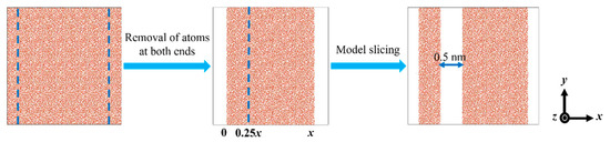 Atomistic slicing method [25] is used to calculate the specific surface energy of amorphous SiO2 (Model III), as shown in Figure 3. First, the atoms at both ends of the model are removed to avoid the influence of periodic boundary in the direction where the specific surface energy needs to be measured, and the total energy of the system is calculated. Afterwards, the model is cut in the middle and a vacuum layer with a thickness of 0.5 nm is established to prevent the interaction between the atoms in the two parts after slicing, and the total energy of the system is calculated again. The subscript of the model number in Figure 3 represents the position of the cut plane; for example, x0.25 represents the cut plane at position 0.25x.