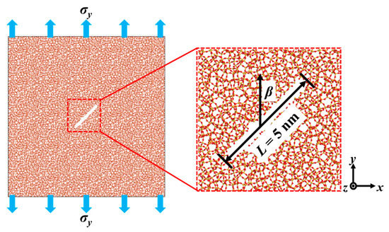 Crack models with the same length and different angles are obtained by deleting atoms in a specific region selected in Model III. The crack length and width are 5 nm and 0.5 nm, respectively. As shown in Figure 5, the crack angle is defined as the angle between the long edge of the crack and the direction of tensile load (y-direction), = 0°, 30°, 45°, 60°, 90°. The system temperature and pressure are set to 300 K and 1.013 × 105 Pa. The crack models are relaxed for 10 ps in NPT ensemble [14,15]. Sanjib’s study pointed out that the transition strain rate of simulation is 2.5 × 1011 s−1 [23]. In this study, the strain rate is set as 5 × 109 s−1 [15].
