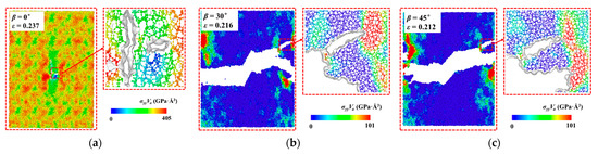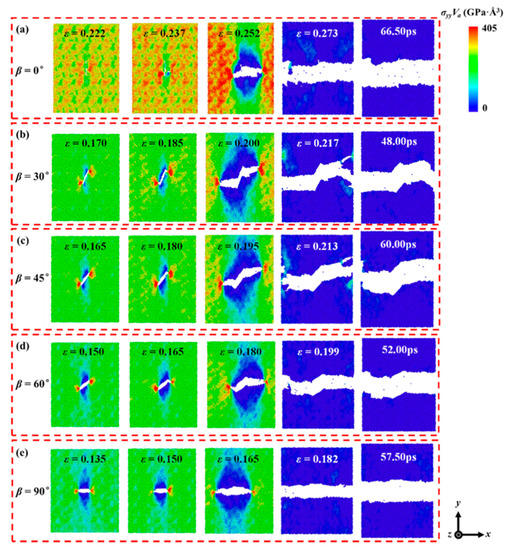 OVITO software [31] is used to visualize the simulation process. The effect of crack angle on the mechanical properties of the crack models is shown in Figure 6 and Table 4.