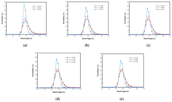 The distribution of Si-O bond length in the fracture process of (a) 0°, (b) 30 °, (c) 45 °, (d) 60 °, and (e) 90 ° crack models.