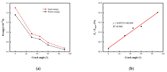 With the crack angle increases, the maximum elastic energy stored at the ultimate strain decreases from 1.735 × 10−15 J at 0° to 6.634 × 10−16 J at 90° with the former being 2.615 times the latter. The decrease in elastic energy is the largest in 0°~30°, as shown in Figure 11. The corresponding input energy decreases from 1.954 × 10−15 J at 0° to 7.084 × 10−16 J at 90° with the former being 2.758 times the latter. The elastic energy efficiency (i.e., ) increases from 88.796% at 0° to 93.654% at 90° with a slow and steady increase. A linear regression model is used to fit the trend of elastic energy efficiency, with a correlation coefficient R2 of 0.986. It can be seen from Figure 7 that the increase in the crack angle will affect the components of tensile and shear loads around the crack, making the stress concentration area at the crack tip decrease with the increase in the crack angle, thus affecting the elastic energy and energy efficiency at the ultimate strain. The input energy at elastic deformation stage is mainly converted into elastic energy and dissipative energy.