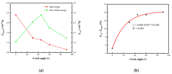 Input energy, new surface energy, and new surface energy efficiency of different crack models. (a) The relationship between input energy, new surface energy and crack angle after fracture; (b) the new surface energy efficiency of different crack models after fracture.