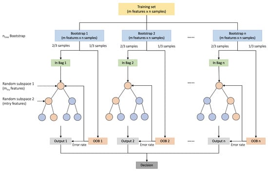 The Random Forest algorithm, initially introduced by Ho [21] in 1995 and later extended by Breiman [22] in 2001, is a robust method applicable to classification and regression problems, as illustrated in Figure 1. The algorithm utilizes a technique known as “bagging”, or bootstrap aggregating, to generate an ensemble of classification or regression trees (referred to as ).