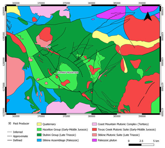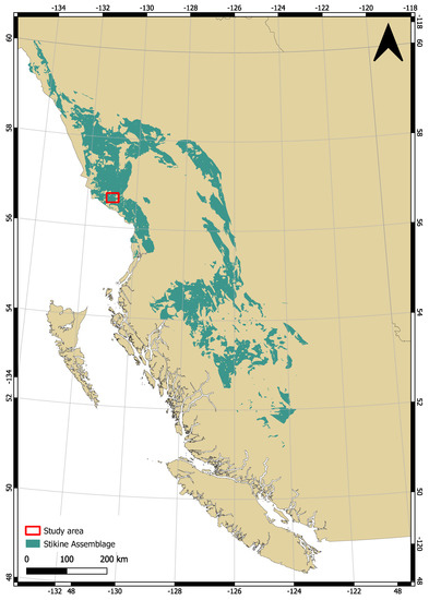 The area under study situated within the Stikine Terrane encompasses three distinct geological units, as illustrated in Figure 3. The most ancient of these formations is the Stikine Assemblage comprising deformed and metamorphosed marine sedimentary rocks, clastic sedimentary formations, and volcanic material, all dating back to the Upper Paleozoic epoch [24]. These primordial rocks lay the foundational geological context for the region.
