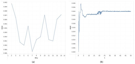Figure 6 and Figure 7 display the RMSE variation for different parameter values within each model. Given that the RF and have only one parameter (with RF’s second parameter k fixed, as discussed in Section 4.2), their behavior differs from that of and SVM with a polynomial kernel (), which contain two and three parameters, respectively.