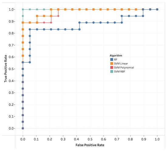 In the context of overall accuracy, all the SVM models demonstrated superior performance over the Random Forest (RF) model, with accuracies of 89%, 97%, and 89% for the linear kernel (), Radial Basis Function kernel (), and polynomial kernel (), respectively, as detailed in Table 4. Furthermore, an examination of the ROC probability curves in Figure 8 reveals that the RF model is consistently outperformed by all three SVM variants.