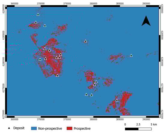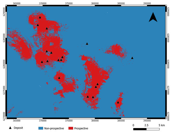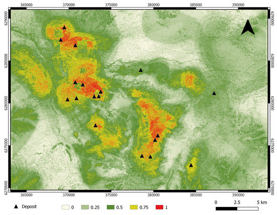 Although the RF model’s accuracy was moderately lower (78%), the RF-generated mineral prospectivity map required only 15% of the total area to delineate all the deposits (Figure 10). This compact area, contrasted with the 50%–60% area required for SVM-generated maps, led us to choose the RF mineral prospectivity map as the final predictive map for epithermal Au deposit potential (Figure 11).