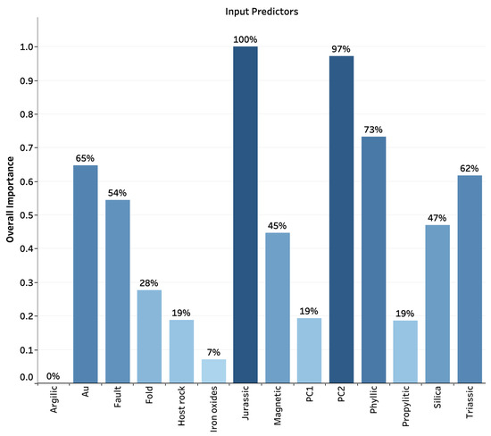The interpretability of RF was another key aspect of our study. The model elucidated the relative importance of the input predictors, identifying proximity to Jurassic intrusions as the top-ranked feature, followed by multi-element geochemical anomalies and phyllic alteration. Additionally, the proximity to faults was identified as the sixth most important feature, indicating the importance of geological structures in the mineralization process.