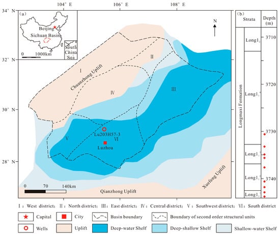 (a) Regional geological map of Sichuan Basin (modified after [32,33,34,35]). (b) Stratigraphic column.