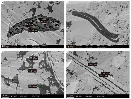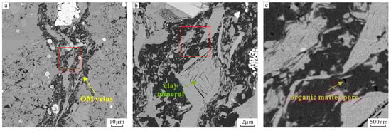According to the source of organic matter and its occurrence under SEM, the types of organic matter in the study section are divided into in situ sedimentary organic matter, organic matter migrating to inorganic pores and organic matter migrating to fractures (OM veins). Among them, the in situ organic matter is the most primitive organic matter deposited in the process of sedimentation, so it retains some biological structure characteristics. However, because it comes from different organic components, its morphological performance is not exactly the same (Figure 2a,b). But as a whole, the area of in situ organic matter is large and the boundary between the organic matter and mineral particles is also obvious. The organic matter in the inorganic pores is the most common type of organic matter in the studied section [5], and it is the bitumen generated by in situ organic matter in the process of hydrocarbon generation and expulsion. The area of organic matter in inorganic pores is small and its morphology is controlled by the pores of the mineral matrix before filling, which include intergranular pores, pyrite intercrystalline pores, clay mineral interlayers, and mineral particle cracks (Figure 2c,d). The organic matter in the fracture usually runs through the entire scanning electron microscope field of view with an opening of 5~80 μm (Figure 3).