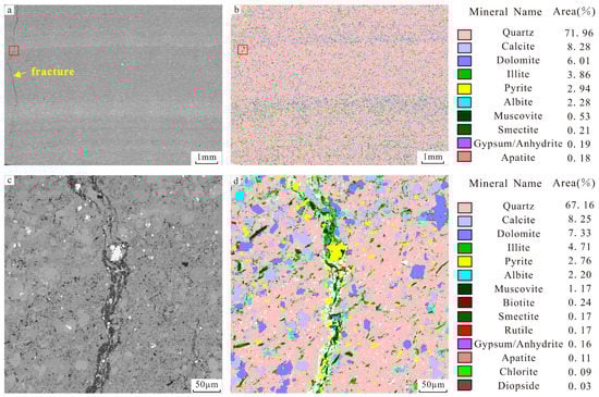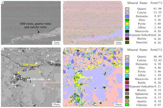 Scanning electron microscope image of Lu203H57-3 well (Long111 layer, 3742.9 m). (a) MAPS scan image (500 nm resolution), visible veins. (b) QEMSCAN scanning image (15 μm resolution). (c) Figure 3a amplified image, MAPS scan image (4 nm resolution), the characteristics of organic matter vein, quartz vein and calcite vein can be seen. (d) Figure 3b amplified image, QEMSCAN scanning image (1 μm resolution).