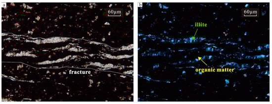 The thin section of Long11 sub-member of Lu203H57-3 well. (a) Long112 layer, 3741.8 m, filled with organic matter and illite in horizontal fractures (plane polarized light). (b) Long112 layer, 3741.8 m, filled with organic matter and illite in horizontal fractures (perpendicular polarized light).