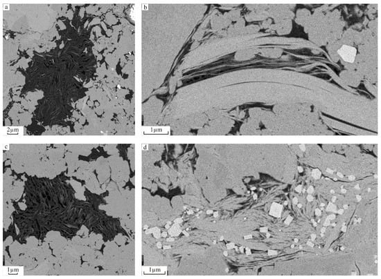 Microscopic observation shows that the organic matter filled in the fracture is associated with clay minerals. Previous studies have shown that the mixture of the original deposited structural organic matter and clay minerals is quite common in Marine shales, this is due to the crystal structure and huge specific surface area of clay minerals, which have a strong ability to adsorb organic matter [41]. The mixture of the organic matter and clay minerals in the study section usually occurs in the following two forms. One is acicular clay minerals interwoven in organic matter (Figure 8a,c), and the other is organic matter in clay minerals (Figure 8b,d); organic pores are developed in both of them, which have the potential for hydrocarbon generation. However, the occurrence of clay minerals near OM veins is different from the above; the contact interface between organic matter and clay minerals is sharply defined (Figure 7), there is no obvious tendency for them to contact, react and promote each other, and the lack of pore development of OM veins also indicates that clay minerals here do not promote the hydrocarbon generation process of OM veins. Therefore, we infer that the charging period of OM veins is later based on their morphology and low porosity efficiency.