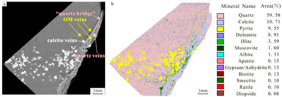 Scanning electron microscope image of Lu203H57-3 well (Long112 layer, 3740.6 m). (a) MAPS scan image (500 nm resolution), OM veins, quartz veins and calcite veins can be seen. (b) QEMSCAN scanning image (15 μm resolution).