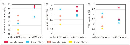 This study also further identifies the quality of the reservoir in the organic veins. Data display that the brittle mineral content of the samples with OM veins is more than 70%, with an average of 78.98%, while the brittle mineral content of the samples without OM veins is lower, ranging from 50% to 75%, with an average of 61.09%. The average organic porosity of the samples with OM veins is 2.18%, while the average organic porosity of the samples without OM veins is 1.72%. The samples with OM veins have higher brittle mineral content and organic porosity and are mostly developed in Long111 and Long112 layers. For TOC content, the average TOC of samples with organic matter veins is 3.69%, while the average TOC of samples without organic matter veins is 3.4%. The TOC content of samples with OM veins development is slightly higher, and the overall difference is not significant (Table 2).