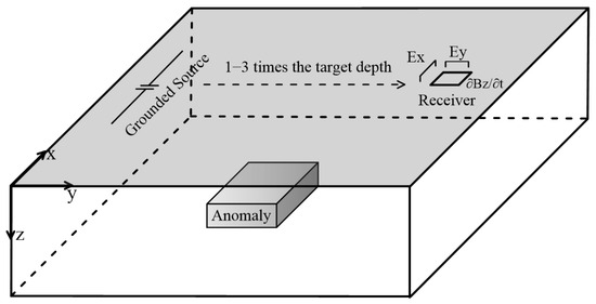 - Newman, G.A. Deep transient electromagnetic soundings with a grounded source over near-surface conductors. Geophys. J. Int. 1989, 98, 587–601. [Google Scholar] [CrossRef]