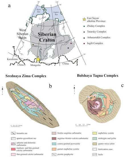 (a) The schematic geological maps and locations of the ultramafic–alkaline complexes in the south part of the Siberian craton; (b,c) schematic geological maps of the Srednaya Zima (53°27′ N; 100°25′ E) and Bolshaya Tagna (53°38′ N; 100°28′ E) intrusions. The localities of samples for U–Pb study are demonstrated on maps [33].