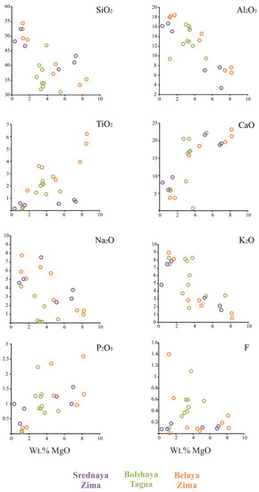 MgO variation diagrams for ultramafic–alkaline rock series of Srednaya Zima, Bolshaya Tagna (author’s data), and Belaya Zima complexes [33].