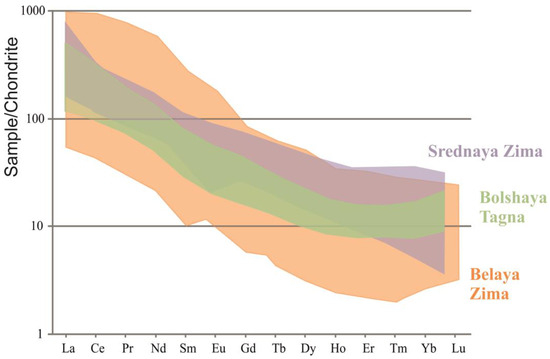Geochemical studies show that rocks of the alkaline ultramafic complexes are generally characterized by a high content of rare earth elements (Supplementary Materials Table S2). Foidolite series rocks contain 281 to 495 ppm REE, alkaline syenites (81 to 688 ppm REE). The studied rocks demonstrate LREE enrichment, with LREE (La–Eu)/HREE(Gd–Lu) ranging from 5.4 to 94. REE in the spectra, and rock from the Bolshaya Tagna and Srednya Zima are generally similar to Belya Zima alkaline silicate rocks (Figure 3) [33].