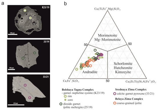 (a) Back-scattered electron (BSE) images of garnet crystal from studied rock samples; (b) chemical composition of calcic garnets from the present study and garnet from ijolite from Belaya Zima complex [12], expressed in terms of the principal end-member components (mol.%).