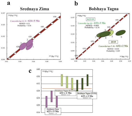 Andradite from Srednaya Zima calcite–garnet pyroxenite was used for a U–Pb geochronological study. In total, three garnet fractions were selected for analysis (analyses 1–3, Table 1; Figure 6a). The studied samples were characterized by high U contents (8–10 ppm) and low levels of common Pb (Pbc/Pbt = 0.1–0.2). The data points were concordant (#2 and 3, Table 1) or slightly discordant (#1, Table 1), and yielded a concordia age of 624 ± 5 Ma (MSWD = 0.31, the probability of concordance = 0.58). The weighted average of 206Pb/238U ages of all analyzed garnet fractions (#1–3, Table 1) corresponded to an age of 623 ± 5 (MSWD = 1.6), which is close to the concordia age (Figure 6c). However, the obtained U–Pb garnet age is the first geochronological data to be reported for the Srednaya Zima complex.