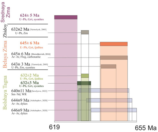 Numerous recent studies have convincingly shown that Ca–Fe–Ti garnets offer unique opportunities for the timing of magmatic events, with a temporal resolution comparable to that of zircon dating. In this study, we presented new U–Pb (ID–TIMS) geochronological and geochemical data for Ca–Fe–Ti garnets from two complexes of the Eastern Sayan magmatic province and whole-rock geochemistry. Combining new geochronological data with those previously published for the Belaya Zima complex (645 ± 6 Ma), we provide information on the duration of the main magmatic event and the timing of alkaline ultrabasic complexes of the Ziminsky ore district of emplacement (Figure 1a). The new data provide an age range (ca. 650–624 Ma) with the possible relative age order Belaya Zima (ca. 650 Ma), Bolshaya Tagna (ca. 633 Ma), and Srednaya Zima (ca. 624 Ma). No geochronological data for the latter complex were available before our study. As demonstrated in Figure 7, the precision and accuracy of our U–Pb garnet geochronological study are similar to those using U–Pb zircon age determination, allowing us to evaluate the pulses of magmatic activity within the Eastern Sayan province.