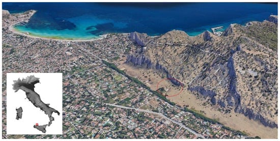 Monte Pellegrino is an isolated relief located northwest of the Gulf of Palermo (Sicily, Italy), which is part of the mountain system surrounding the Piana di Palermo, the vast flat area on which the urban layout of the Sicilian capital has developed (Figure 2). From a geological point of view, Monte Pellegrino is a homogeneous massif made up of carbonate and dolomitic sedimentary rocks, covering an area of about 6.5 sq km with a maximum height of 606 m [3,4].