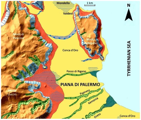 - Agate, M.; Di Maggio, C. Assetto geologico della Piana di Palermo e dei monti circostanti. In La geomorfologia di Palermo; Agnesi, V., Ed.; Sapienza Università Editrice: Roma, Italy, 2021; pp. 7–14. [Google Scholar]