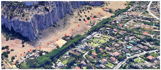 Aerial photo with red dots highlighting the Sentiero Landolina, the path at the foot of the western slope of Monte Pellegrino that passes over the buried remains of the Valdesi prehistoric settlement and intercepts the necropolis (modified from Google Earth).